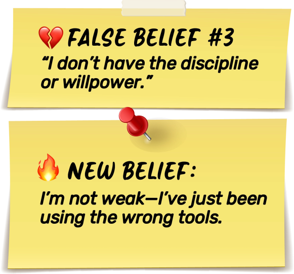 If the instructions you've been following don't work, no amount of discipline or willpower is ever going to bring success. Trying to fix your body with willpower is like trying to pound nails with a screwdriver; you'll make some progress, but you'll likely also bend the nails, bruise your knuckles, and never get the job completed. Using the correct instructions plus aligning your thoughts and emotions with your health goals changes everything.